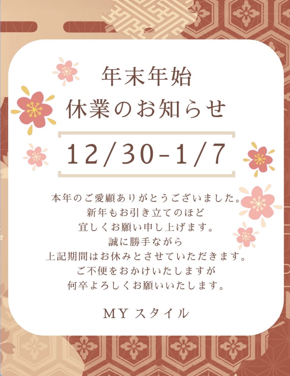 年末年始休業のお知らせ